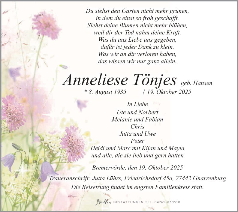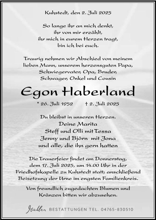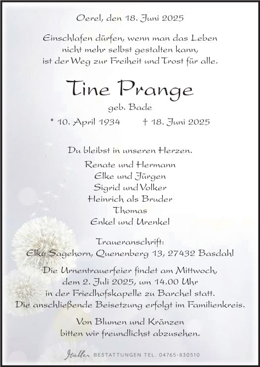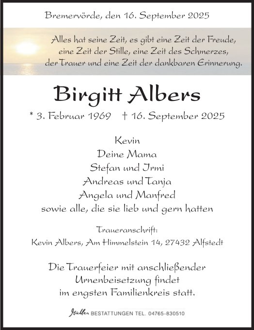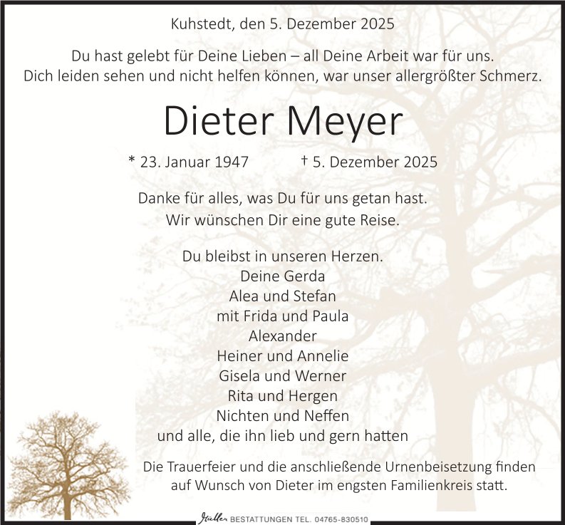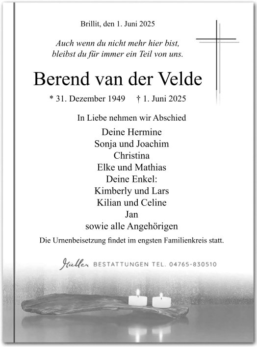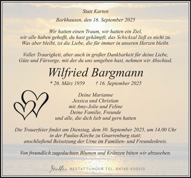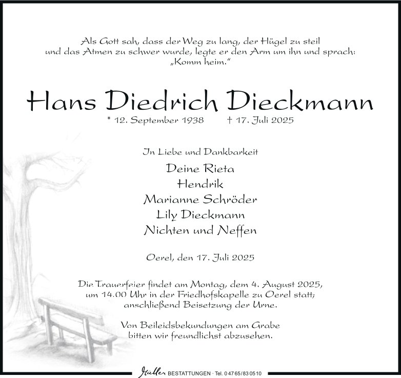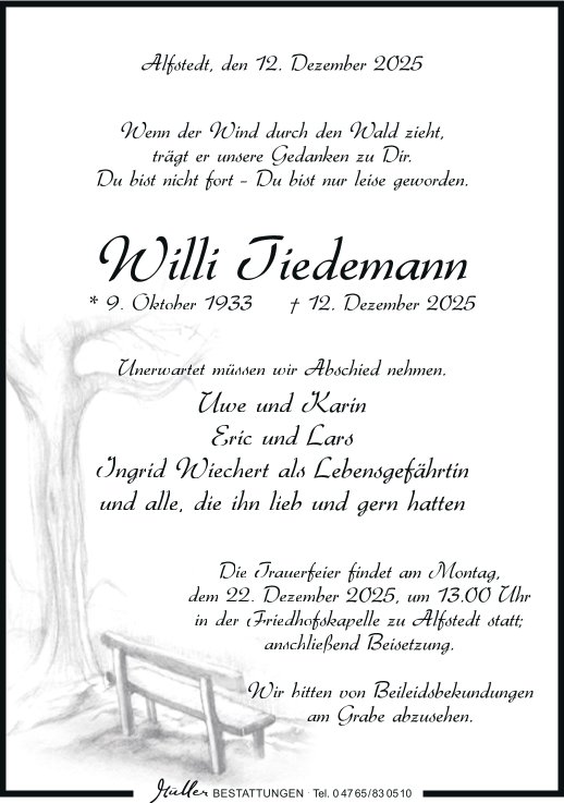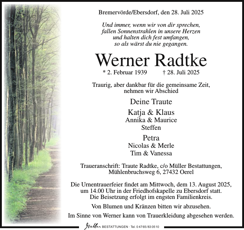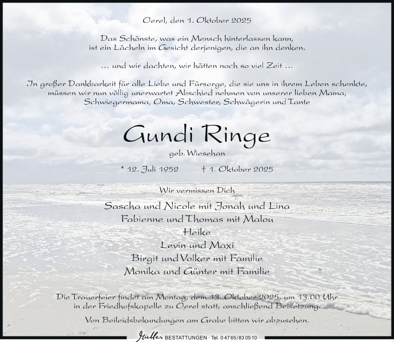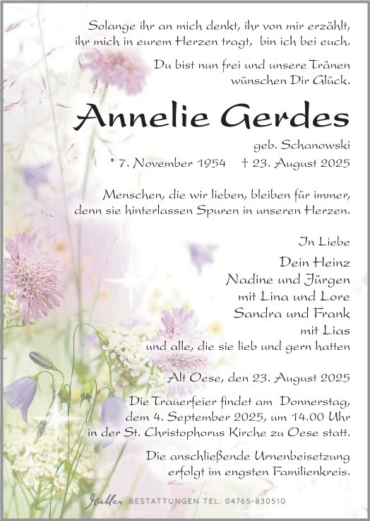Die Trauerfeier findet am 5. November 2022 um 11.00 Uhr in der Findorff-Kirche zu Iselersheim statt.
