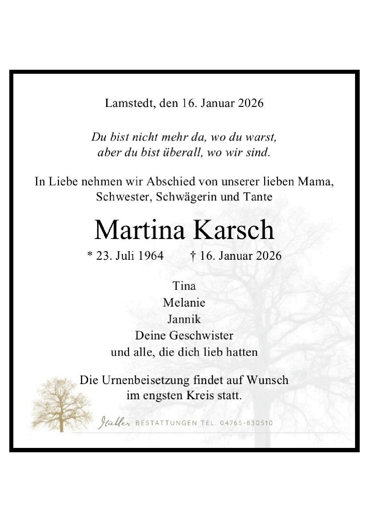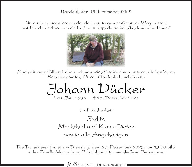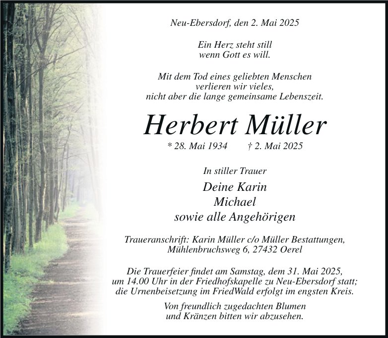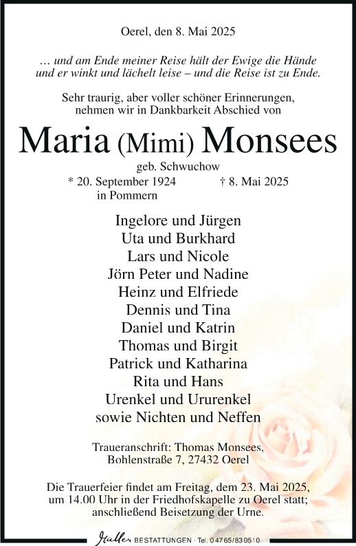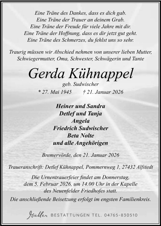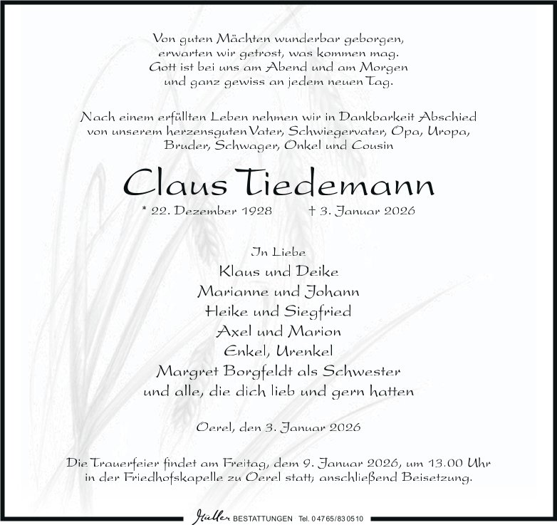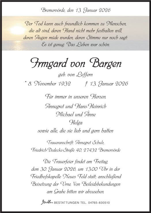 Die Trauerfeier findet am 5. November 2022 um 11.00 Uhr in der Findorff-Kirche zu Iselersheim statt.